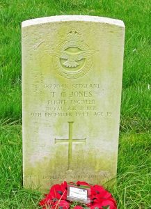 Trevor Charles Jones, Sergeant (Flight Engineer), 1837048, Royal Air Force Volunteer Reserve. Trevor was born in 1925, the son of Ernest James Jones and Elizabeth Emma Jones (nee Coopey), of Hucclecote, Gloucestershire. He enlisted into the Royal Air Force Volunteer reserve and trained as a Flight Engineer prior to being posted to 166 Squadron, Royal Air Force, which had been reformed in January 1943, at RAF Kirmington, in Lincolnshire, as a heavy bomber squadron, flying Wellingtons and Lancasters. On 9 December 1944, Trevor was taking part in a navigational training flight, when the aircraft encountered severe turbulence above the Black Mountains. Four servicemen bailed out, including Trevor, but he was injured whilst making his escape and died later the same day. The remaining three aircrew remained on board the aircraft which subsequently made a successful emergency landing at RAF Fairwood Common, near Swansea. Trevor was just 19 years old when he died on 9 December 1944. His body was recovered from the Black Mountains near Myddfai and he was buried in Saints Philip and James Churchyard, Hucclecote, Gloucestershire. He is commemorated on a small brass plaque inside Myddfai Church.