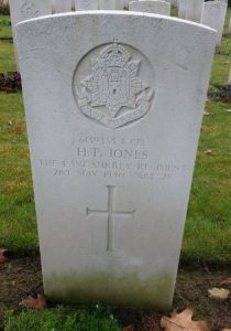 Harold Teify Jones, Lance Corporal, 6139353, East Surrey Regiment. Harold, known as Teify, was born in 1912, the son of Isaac Jones and Emily Jones, of Tegfan, Ponterwyd. He had enlisted into the army in 1940 and by the time that war was declared upon Germany was serving with the 1st Battalion, East Surrey Regiment. Teify had spent the first eight years with the Battalion in India, then in 1938 the Battalion moved to the Sudan, where a number of men of the Battalion became employed as extras in the filming of The Four Feathers. The Battalion returned to England in February 1939, as part of the 11th Infantry Brigade, 4th Infantry Division and was sent to France with the British Expeditionary Force (BEF) in October and over the coming months prepared for a possible German invasion of France and the Low Countries. Teify came home on leave from France for the last time in February 1940, spending a few days with his parents before returning to the front. Early on 10 May 1940 the Germans began their invasion and quickly broke the French lines, forcing the BEF to withdraw to avoid becoming surrounded, and began their fighting retreat towards Dunkirk. Teify was killed in action during the retreat to Dunkirk, on 21 May 1940. He was 28 years old and is buried in Heverlee War Cemetery, Belgium.